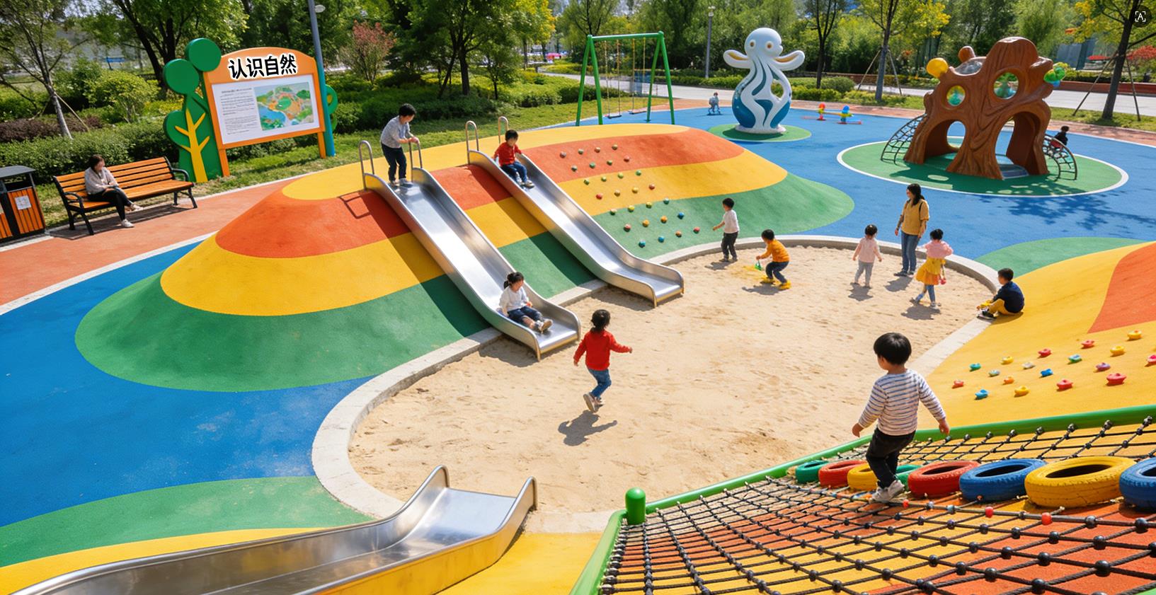 此外,公园儿童游乐区还可融入文化与科普元素,例如通过标识牌介绍游乐设施相关知识,摆放人物、动物造型雕塑,增设日晷、风向标等科普游乐装置,在玩乐中激发儿童对科学知识的探索兴趣。